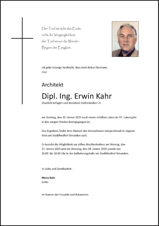 Arch. Dipl.Ing. Erwin Kahrgestorben am 19. Januar 2025