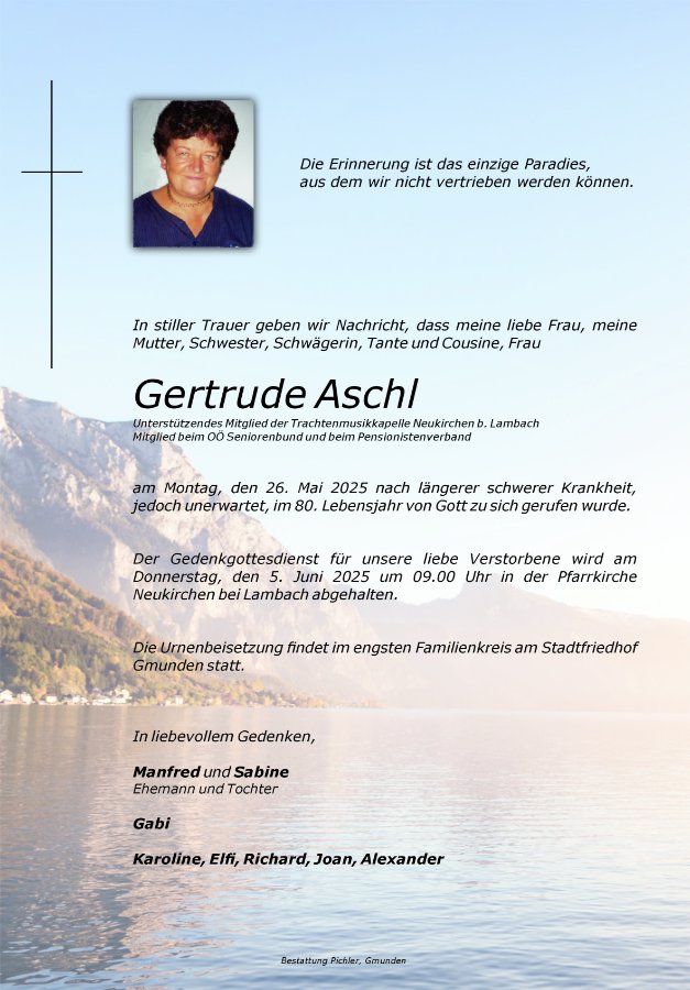 Liebe Gerti, viele Jahre warst Du mit unserer Gemeinschaft verbunden und wir denken gerne an schöne Begegnungen mit Dir zurück. Vor allem die gemeinsamen Erlebnisse bei den Senioren-Reisen werden uns immer in Erinnerung bleiben. Ruhe in Frieden liebe Gerti!